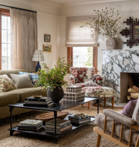 Heidi-Caillier-Design-Seattle-interior-designer-N28 Tudor-printed-floral-chair-living-room-tapered-lampshade-jute-rug-art-pattern-mixing-british-fireplace-marble September 12, 2019